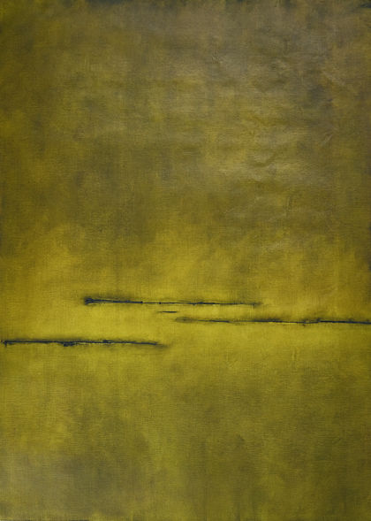 The olive green used in Tapestry is thinned down, sometimes with a medium or after application with alcohol. This has an effect of aged paper or fabric for some works. The scale of each work is a way to account for how big the feeling is. Small and subtle, or large and enveloping. The roughness of the canvas is the tactile sense of the feeling, with some works having no additional primer (most are pre-primed linen). The primer is also used to express movement within a work, with the gestures of my handwork visible where the primer has been applied in a thick layer, and not sanded back.